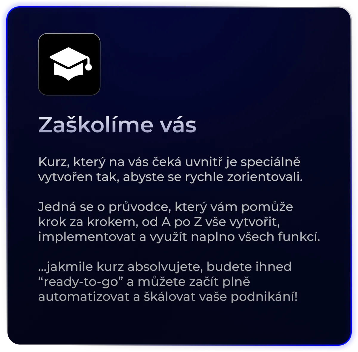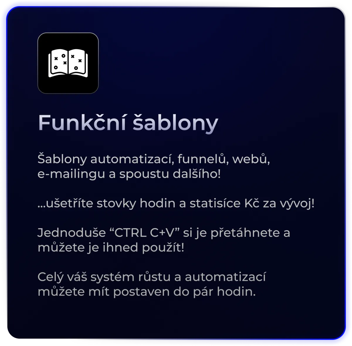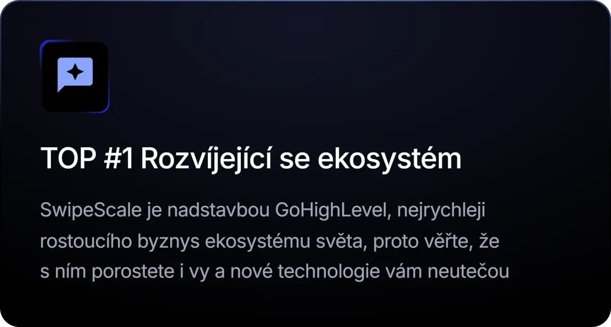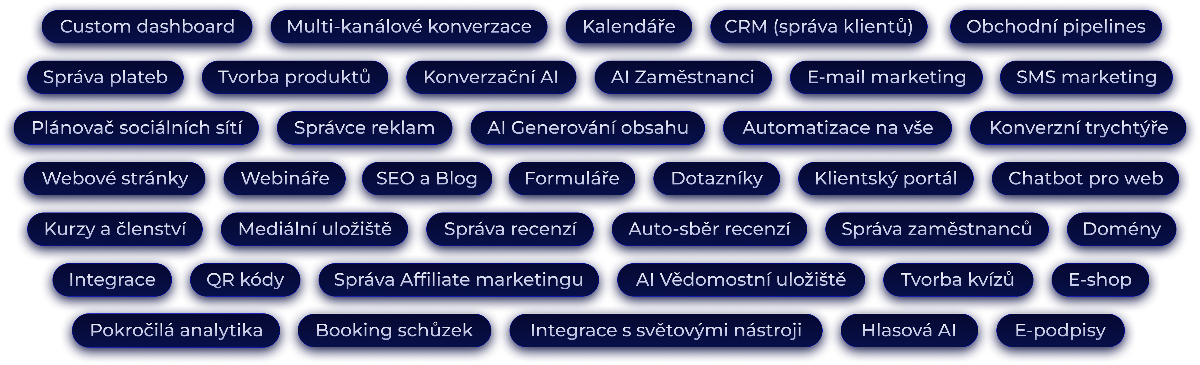 Vše ostatní (CRM, e-maily, kalendáře, funnels, automations, formuláře, SMS, membership, kurzy, chat, AI atd.) máte přímo uvnitř.