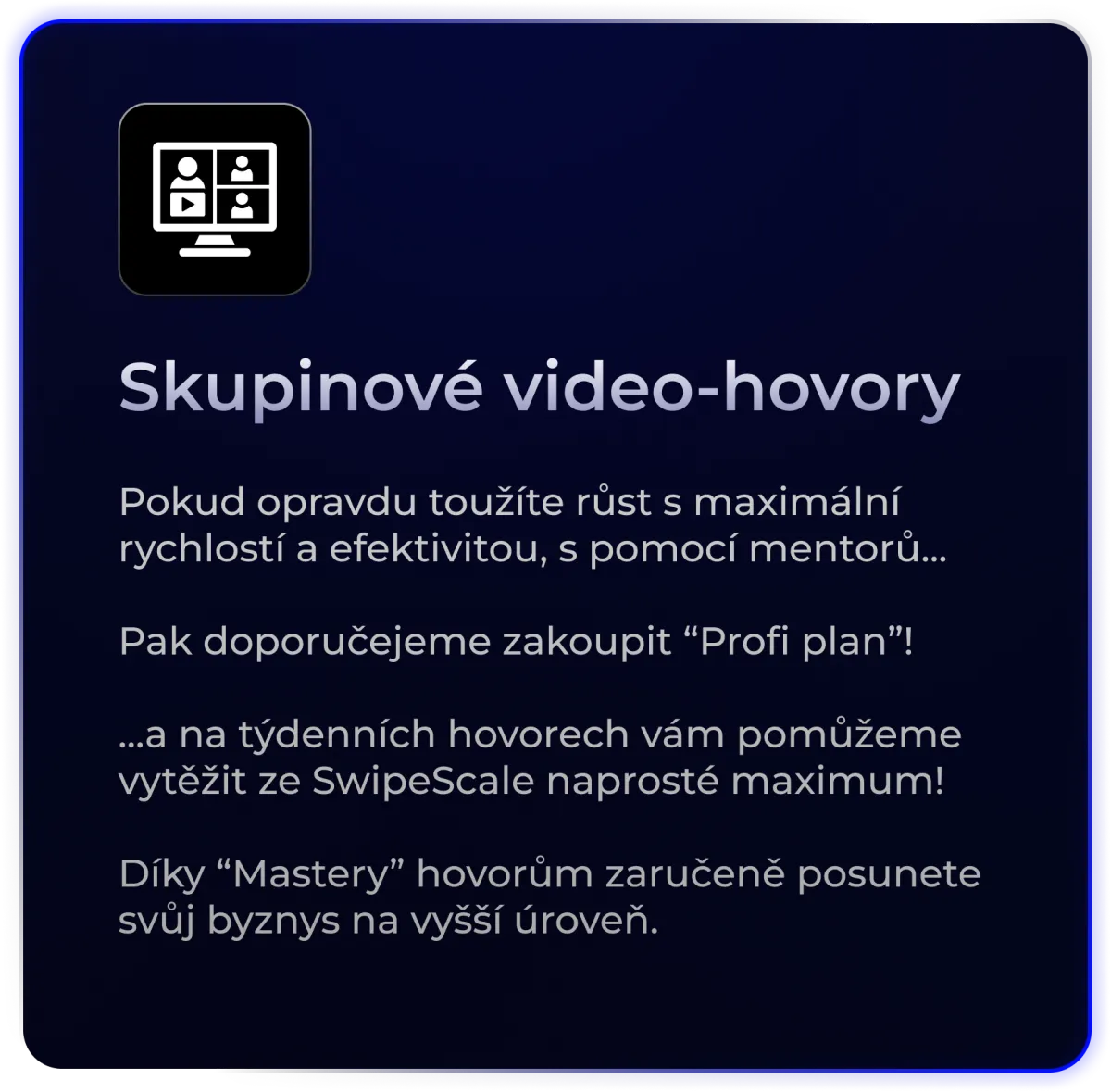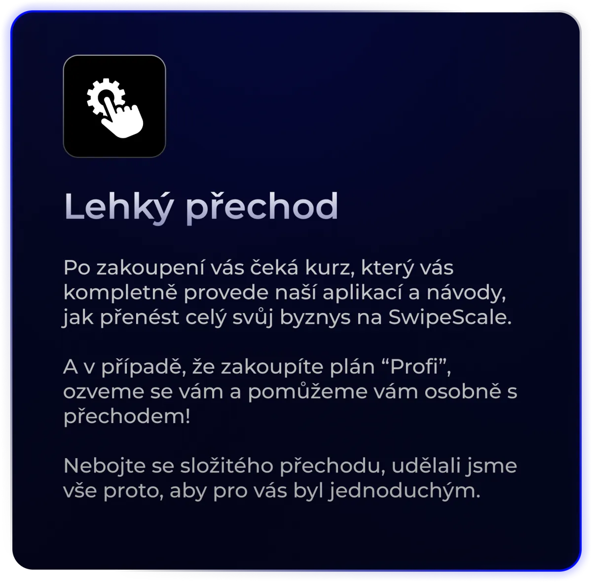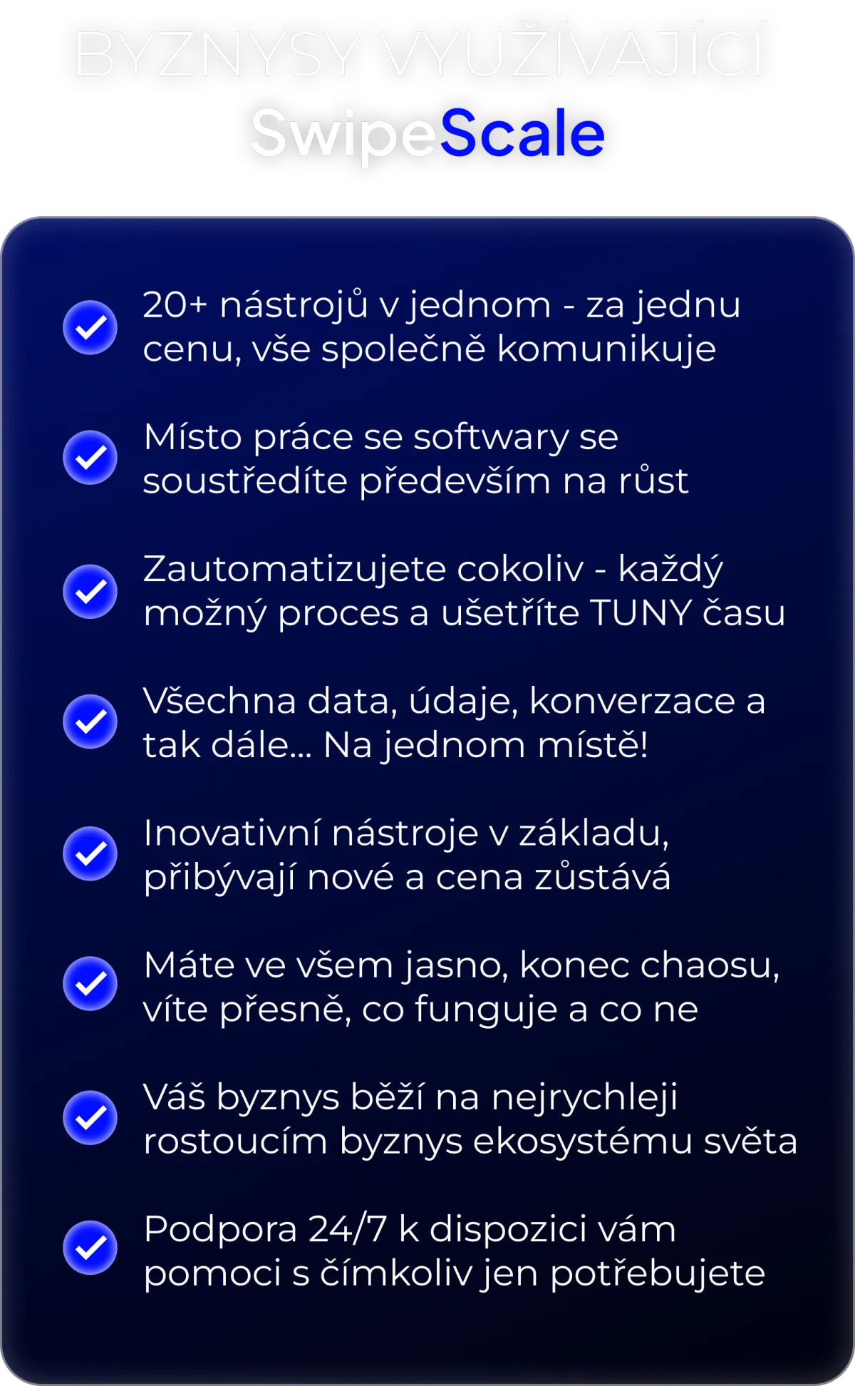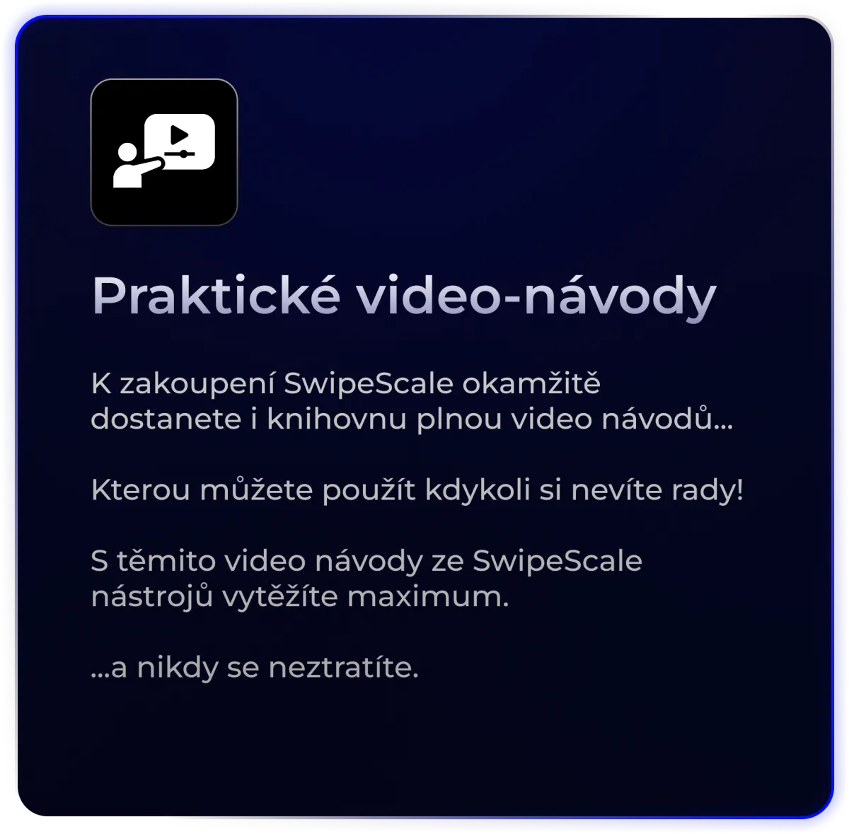 SwipeScale je vytvořený pro podnikatele, kteří nejsou technici, uvnitř naleznete kurz, který vás krok za krokem zaučí a provede všemi funkcemi.