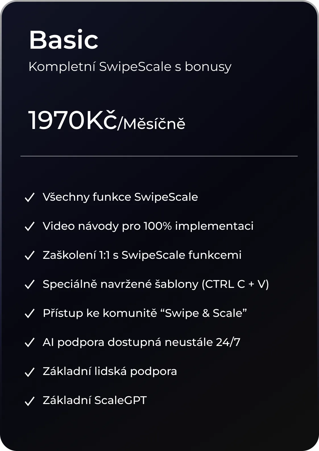 SwipeScale je vytvořený pro podnikatele, kteří nejsou technici, uvnitř naleznete kurz, který vás krok za krokem zaučí a provede všemi funkcemi.